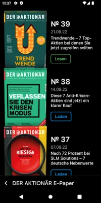 Ponořte se do světa finančních trhů s aplikací DER AKTIONÄR, vaším spolehlivým průvodcem do dynamického investičního prostředí. Čtěte digitální vydání magazínu DER AKTIONÄR, exkluzivní burzovní služby a specialistické zprávy přímo na svém smartphonu či tabletu. Vychutnejte si flexibilní zobrazení na výšku nebo na šířku, včetně intuitivní dvoustránkové orientace pro maximální čtenářský komfort. Nejnovější vydání DER AKTIONÄR je vám k dispozici již ve středu po 22. hodině, abyste byli vždy o krok napřed. Krmivo zpráv nabízí optimalizované procházení, ať už posouváním nebo listováním článků podle vašich preferencí. Nikdy nezmeškáte důležitou informaci díky přehlednému označení nepřečtených položek.